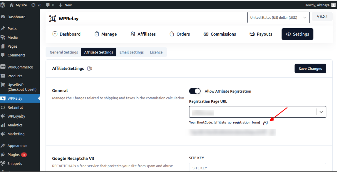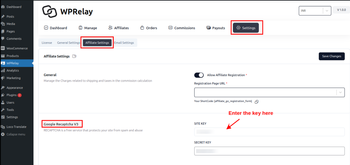 Go to Wordpress -> WPRelay -> Settings -> Affiliate settings -> Google Recaptcha V3