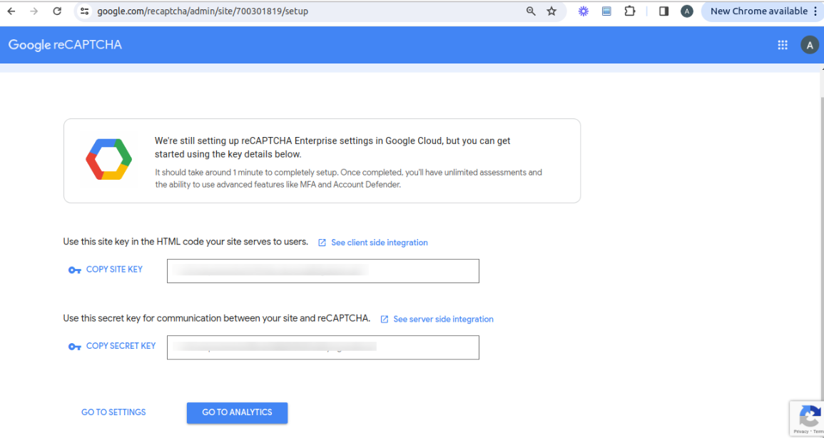 After submitting the form, you will be given a **Site key** and a **Secret key** like this: