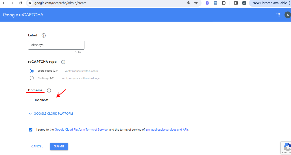 2. Enter a label for your reCAPTCHA. This label will be displayed to users next to the reCAPTCHA badge.